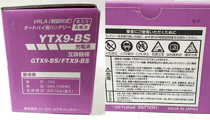 互換GTX9-BS、FTX9-BS 充電液入り充電済 製造国日本製保証期間12カ月または2万km 詳細 電圧:12V 容量:8.0Ah サイズ:長さ151×幅88×高さ106mm 端子形状:E