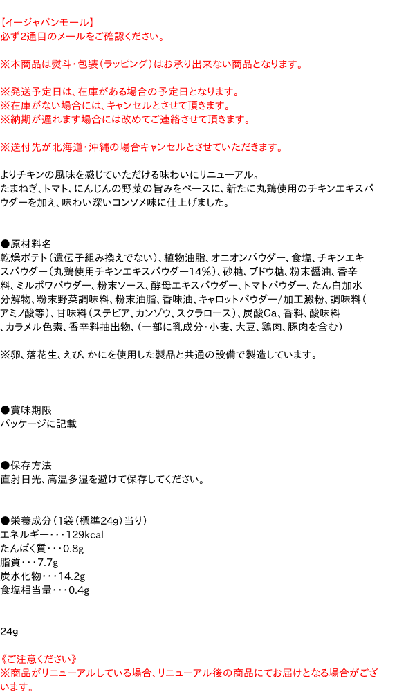 ●原材料名 乾燥ポテト(遺伝子組み換えでない)、植物油脂、オニオンパウダー、食塩、チキンエキスパウダー(丸鶏使用チキンエキスパウダー14%)、砂糖、ブドウ糖、粉末醤油、香辛料、ミルポワパウダー、粉末ソース、酵母エキスパウダー、トマトパウダー、たん白加水分解物、粉末野菜調味料、粉末油脂、香味油、キャロットパウダー/加工澱粉、調味料(アミノ酸等)、甘味料(ステビア、カンゾウ、スクラロース)、炭酸Ca、香料、酸味料、カラメル色素、香辛料抽出物、(一部に乳成分・小麦、大豆、鶏肉、豚肉を含む) ※卵、落花生、えび、かにを使用した製品と共通の設備で製造しています。