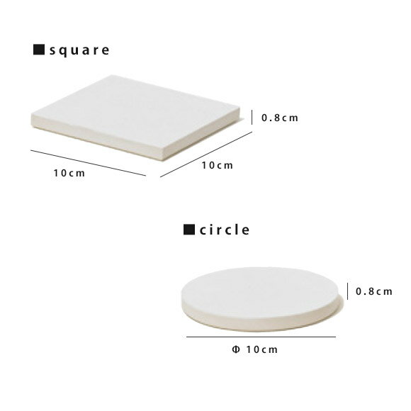 サイズ サークル/直径10×高さ0.8cm スクエア/幅10×奥行10×高さ0.8cm 重量 サークル/約90g スクエア/約125g 材質 ホワイト/秋田県産珪藻土 ブラック/秋田県産珪藻土 + 炭素系顔料 ピンク/石川県産珪藻土 グリーン/秋田県産珪藻土 + 石川県産浅黄土 備考 アソートは各色1つずつの4枚セット、その他は同色の4枚セットになります。