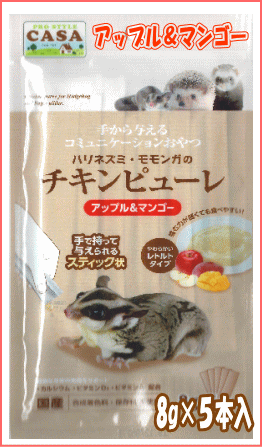 手から与えるコミュニケーションのおやつ!! ハリネズミ・モモンガのチキンピューレ・アップル&マンゴー 容量 8gx5本入り 国産・合成着色料・保存料不使用 コミュニケーションをとりながら、もっとなかよく! おててから、お皿から、お好みの与え方が選べる新しいピューレタイプのおやつです。